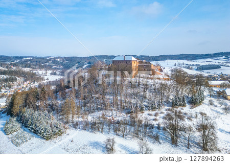 Pecka castle stands majestically atop a hillside covered in fresh snow. The tranquil winter landscape features a clear blue sky and distant hills, enhancing the castle's historic charm.