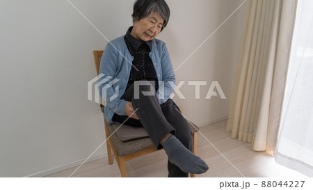 シニア女性の体操 右足を支えながらの曲げ伸ばし