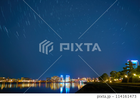 島根県松江市殿町方面の夜景と星の日周運動を白潟公園から見る(松江城,宍道湖大橋,ホテルなど)