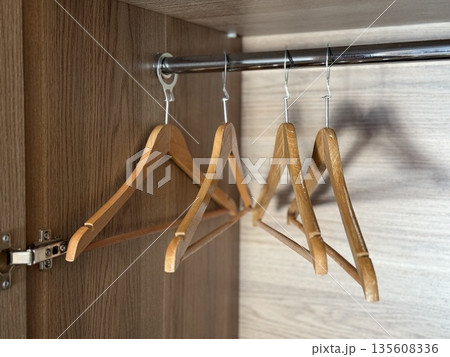 Wooden coat hangers on a metal rod inside wardrobe, providing storage and organization solution