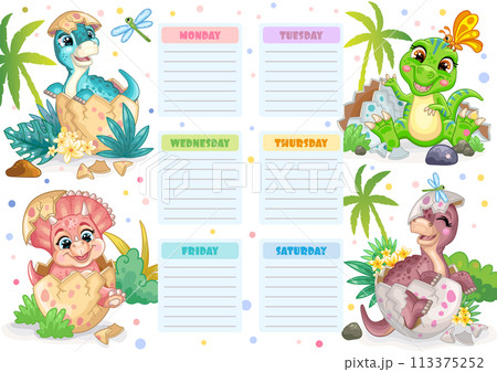 Education timetable schedule with prehistoric dinosaurs. Vector educational lesson planner template for classrooms or kids homeschooling with cartoon dino species in lush, natural Jurassic environment