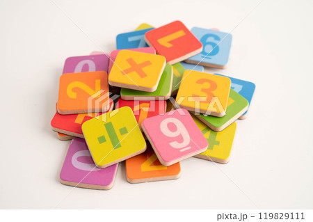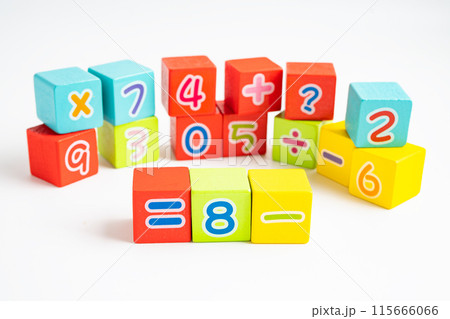 Number wood block cubes for learning Mathematic, education math isolated on white background.