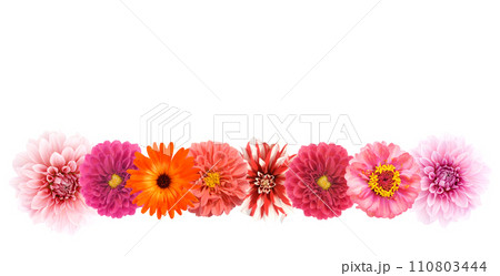 Big set of Zinnia flower isolated on white background. Red, pink, purple, yellow flowers.
