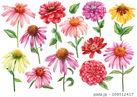Set Multicolor Flowers, echinacea, chrysanthemum, zinnia on a white background. Watercolor botanical illustration