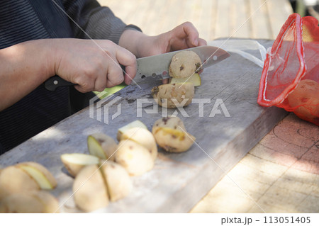 じゃがいもを切る女性
