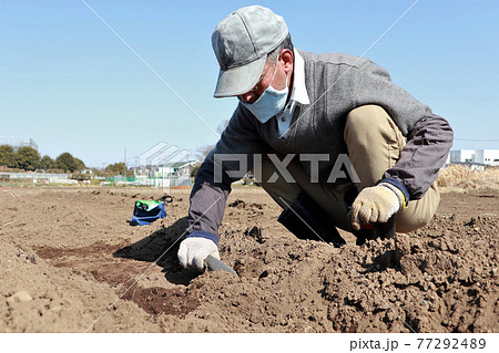 じゃがいもの植え付けをする男性