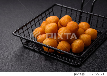 Delicious crispy french fries with salt and spices on a textured concrete background