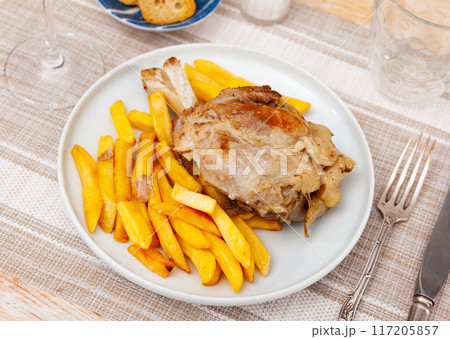 Baked hake fish fillet with french fries and stewed vegetables closeup