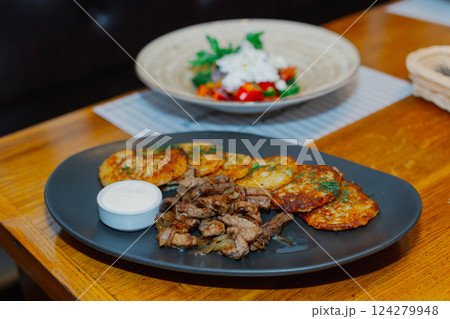Fried french fries with pork meat and fried fern and vegetables on black plate on wooden table