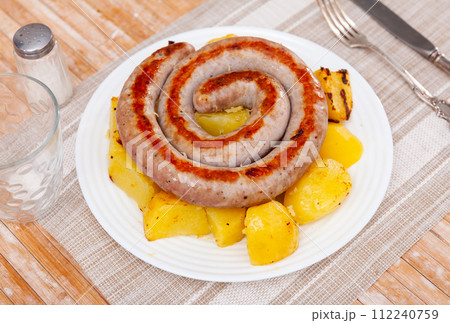 Close-up of bowl with raw homemade blood sausage, pork sausage and chorizo in oven with potatoes. homemade traditional food