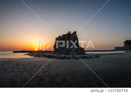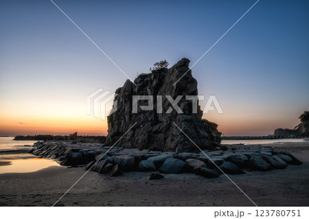 日の出を迎える海岸の鳥居と印象的な岩