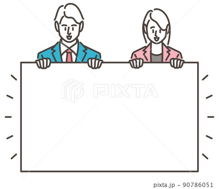コピースペースを両手で持ち下を見る男女ビジネスパーソン【ベクターイラスト素材】
