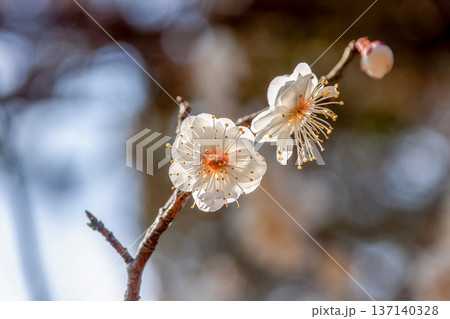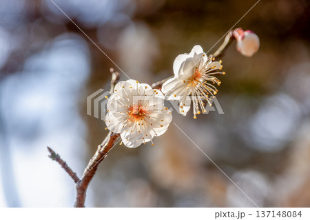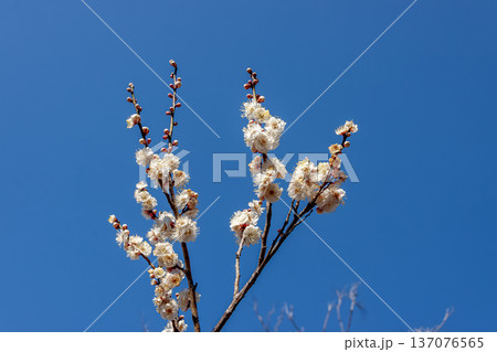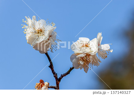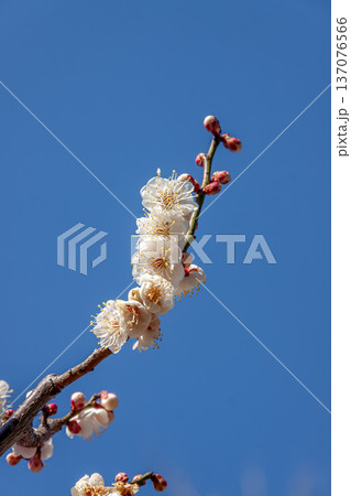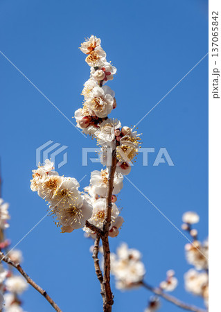青空に映える梅のアップ画像【水心鏡・枝垂れ系】