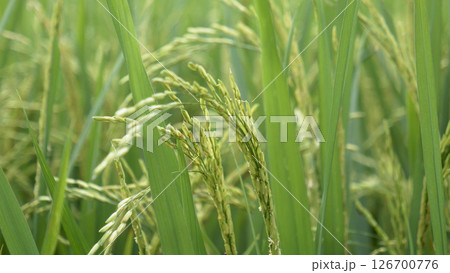 Rice Field Green agriculture ecosystem Asian rice paddy field Vietnam green farm. Harvest agriculture planting cultivation golden green rice terraces in organic farm with tropical natural sunrise.