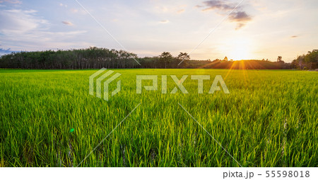 Beautiful sunset over a lush green rice field landscape scene