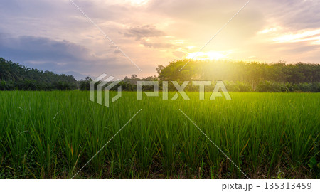Rice Field Green agriculture ecosystem Asian rice paddy field Vietnam green farm. Harvest agriculture planting cultivation golden green rice terraces in organic farm with tropical natural sunrise.