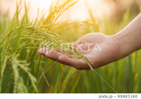 Agriculture Softly touches the ears of rice in the paddy fields.