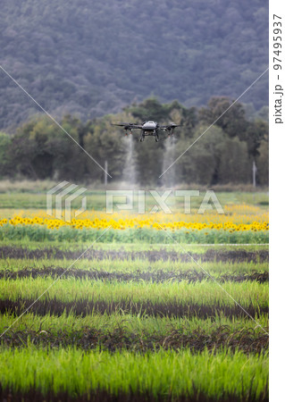 Drone spray pesticide on rice field