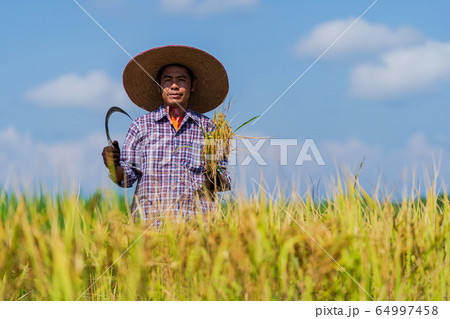 Asian farmer working in the rice field under blue