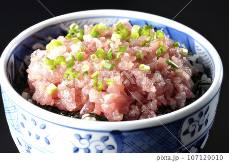 小葱が沢山乗っているマグロのたたき丼を黒背景で撮影