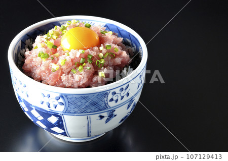 小葱と卵黄が乗っているマグロのたたき丼を黒背景で撮影
