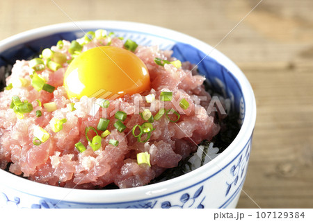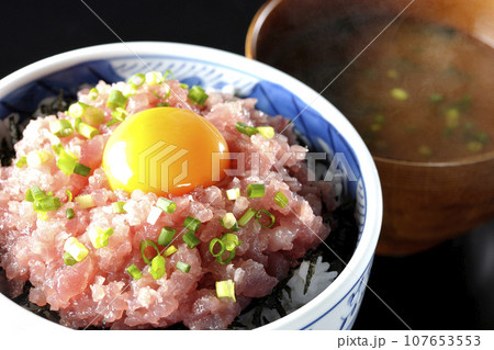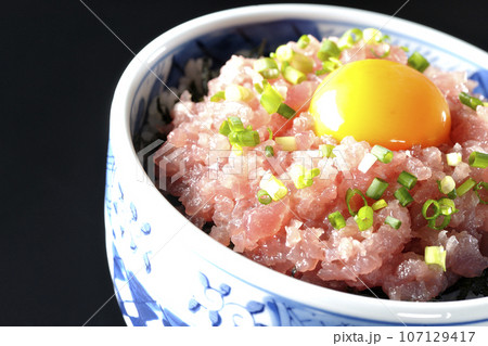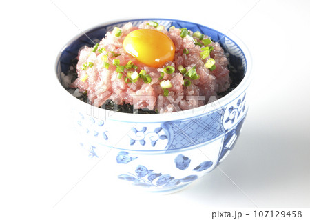 小葱と卵黄が乗っているマグロのたたき丼を白背景で撮影