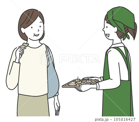 試食販売をするエプロン姿の女性と試食する女性の買い物客