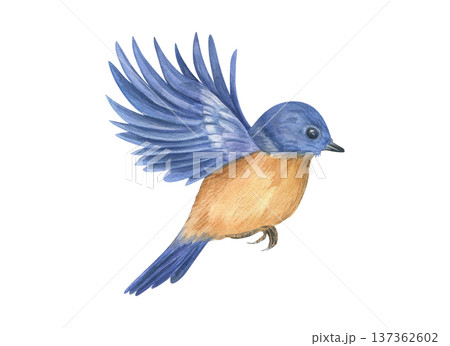 Blue wings spread open and orange breast bird in mid flight watercolor isolated illustration. Hand drawn whimsical woodland song bird for greeting card, invitation, children book, nursery poster