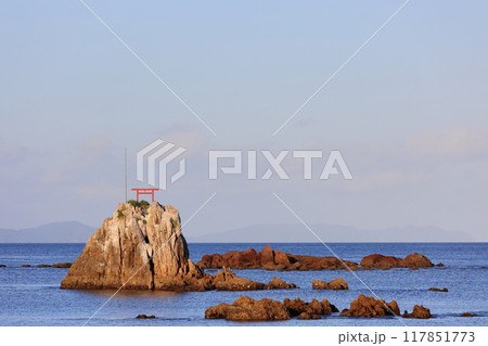 牛之浜景勝地 朝日を浴びる雀瀬の鳥居