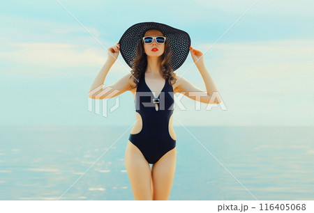 Summer beautiful young woman in bikini swimsuit, black hat, stylish girl posing on the beach on sea
