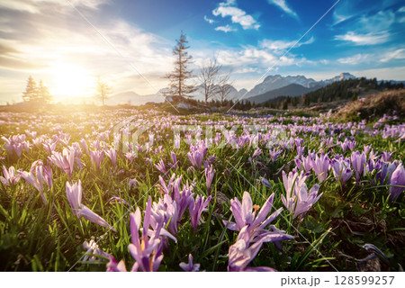 Spring crocus flowers in the green grass, Velika Planina, Kamnic, Slovenia, Easter sunny landscape