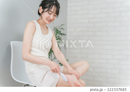 かかとにヤスリをかけてフットケアをする笑顔のアジア人女性
