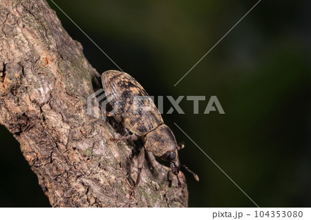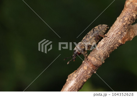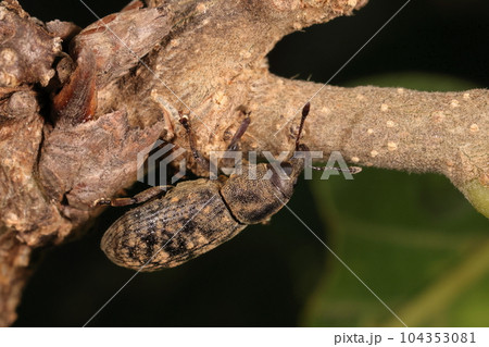 生き物 昆虫 ツツゾウムシ、まだら模様は鱗片や微毛の剥がれ具合で変わる。本体は黒色