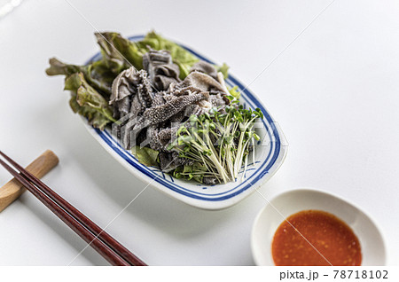 新鮮なセンマイ刺しの盛り付け写真 辛子酢味噌添え