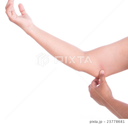 Closeup woman hand checking upper arm on white