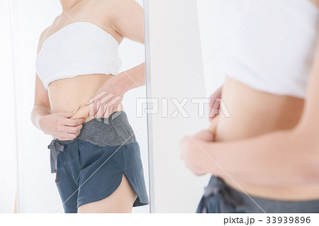 お腹の肉をつまむ女性