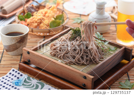 天ざる蕎麦と冷たいビール 夏の和食ランチ 天ぷら付きざるそば 広告・メニュー・飲食店用