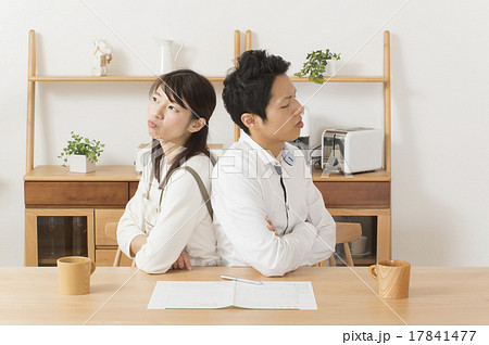 腕を組み目を合わせずそっぽを向く若い男女、夫婦