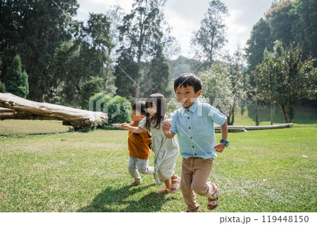 Children are playing joyfully in a lush, green park under the bright sunny sky