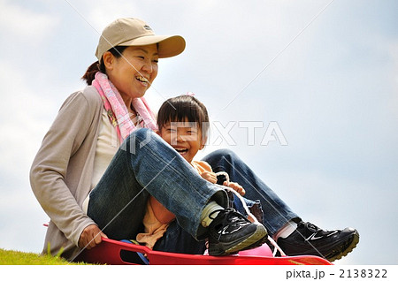 芝スキーを楽しむ母娘(青空)