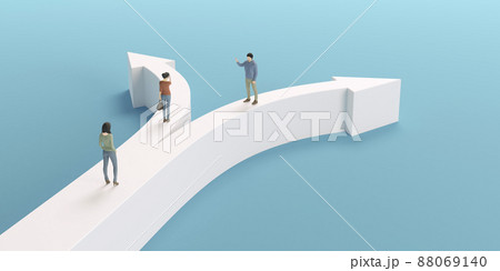 分岐する矢印とビジネスマン / ビジネスの選択肢・異なる方向性・分岐する未来のイメージ