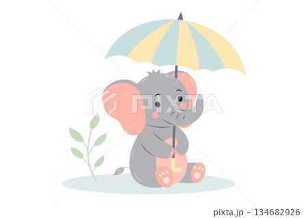 Cute baby elephant sitting with umbrella. Adorable cartoon zoo character. Cartoon flat vector illustration