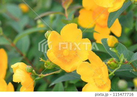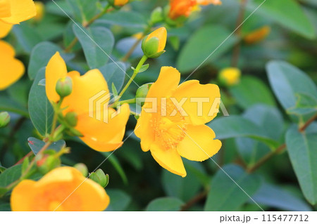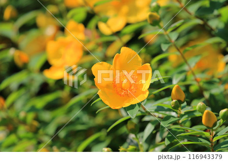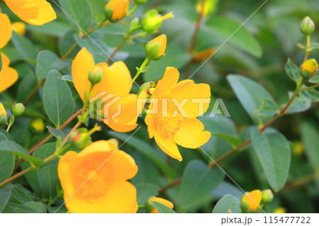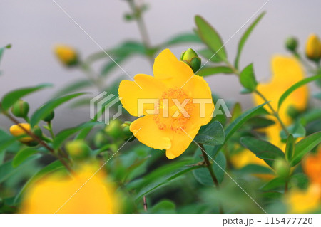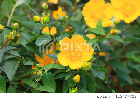 満開の金糸梅(キンシバイ) 花とつぼみ