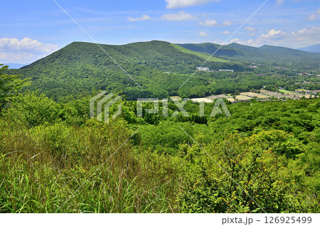 夏の丹沢山地 高指山の草地より望む富士山と山中湖