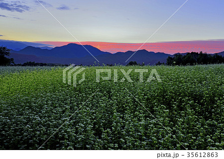福島県南会津郡南会津町八総 舘岩地域の高杖原地区に広がるたかつえそば畑の白い蕎麦の花と夕焼け空