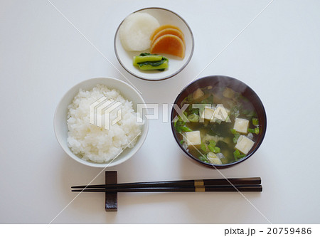 一汁一菜 ごはん 白米 味噌汁 漬物 粗食 湯気 白バック 和食