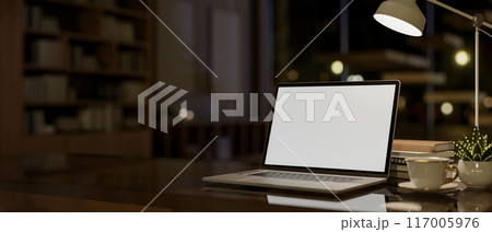 A close-up image of a laptop mockup on a table in a modern office, illuminated by a table lamp.