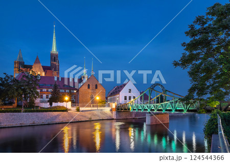 Illuminated Footbridge and Cathedral at Dusk, Poznan, Poland