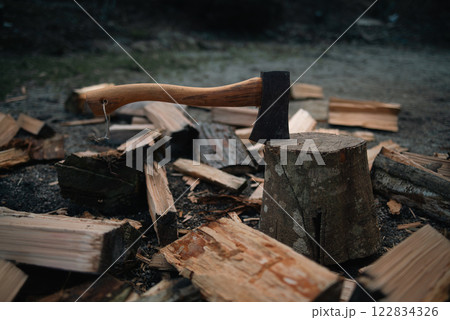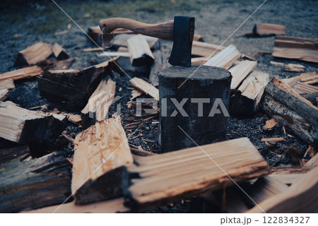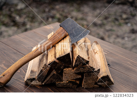 手斧、テーブルに積んだ薪と焚き火の背景