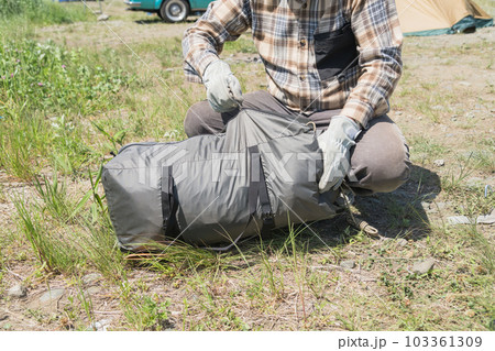 【中津川河川敷でオートキャンプ テントをたたんで袋に入れる】